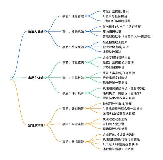 如果把“扫码入企”当成一款服务329万执法人员、数千万企业的国家级政务产品,其核心不是“扫码”这个简单的交互动作,而是通过扫码实现执法全流程的规则落地和数据化管理。结合深圳“行政执法监督码”、甘肃“陇上e企查”、江西“一码通行”的试点经验,我梳理出了一套覆盖事前、事中、事后的闭环需求框架,并设计了对应的产品功能架构思维导图,从执法人员端、市场主体端、监管决策端三个端口落地所有功能,兼顾实用性和创新性。